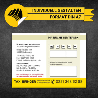 Viele Fahrgäste kommen regelmäßig zu Arztterminen, Therapien oder Behandlungen. Mit professionell gestalteten Terminzetteln bleiben Sie genau dort präsent, wo Ihre Fahrgäste sind: am Empfang von Praxen und Gesundheitszentren.