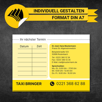 Mit individuell gestalteten Terminzetteln und Terminblöcken bleibt dein Taxiunternehmen direkt in der Arztpraxis, beim Physiotherapeuten oder im Dialysezentrum sichtbar. Die kleinen Blöcke im Format DIN A7 bieten Platz für Terminangaben – und gleichzeitig für deine Taxi-Werbung. Einfach online gestalten, bestellen und als praktische Service-Werbung auslegen.