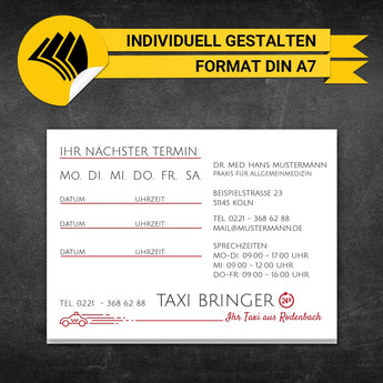 Mit individuell gestalteten Terminzetteln und Terminblöcken bleibt dein Taxiunternehmen direkt in der Arztpraxis, beim Physiotherapeuten oder im Dialysezentrum sichtbar. Die kleinen Blöcke im Format DIN A7 bieten Platz für Terminangaben – und gleichzeitig für deine Taxi-Werbung. Einfach online gestalten, bestellen und als praktische Service-Werbung auslegen.